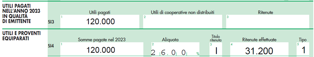 - nel rigo SI3, col 1: 120.000 euro, gli utili pagati nell’anno 2023 in qualità di emittente;